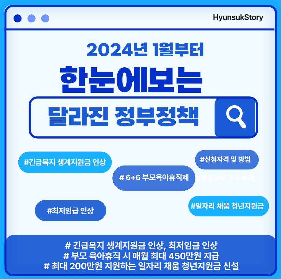 1월부터 달라지는 정부정책을 소개해 드리겠습니다. 첫 번째 최저임금이 시급 9,860원으로 인상, 두 번째 부모육아휴직때 6개월간 최대 450만 원 지원, 세 번째 긴급복지 생계지원금 인상, 네 번째 최대 200만 원을 지원하는 일자리 채움 청년 지원금이 신설되었습니다. 하기 내용 참고 하세요!!